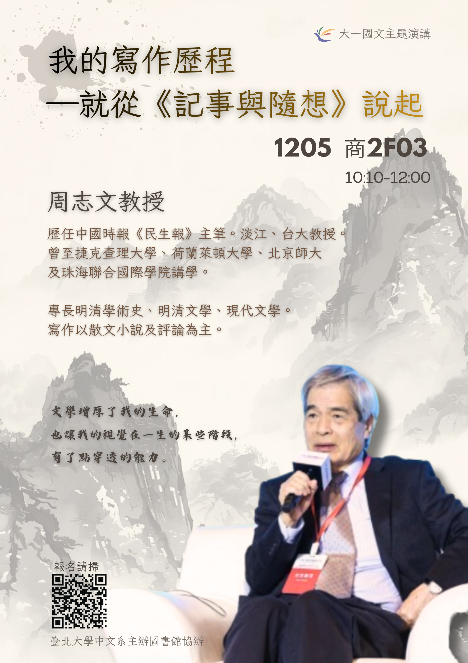 •發表人:陳伯軒兼任助理教授(擬升等副教授) •題目:氣象與宛在:「如」字的表現美學與存在能動性 •時間:114年11月25日(週二)中午12:10-12:25 •地點:人文大樓7F01室